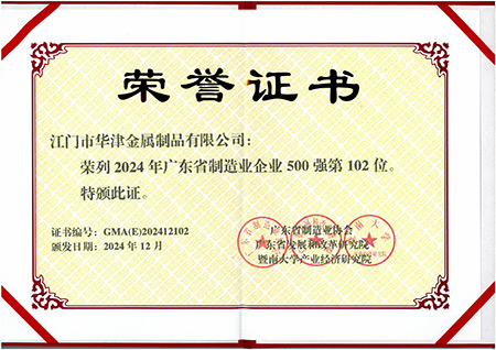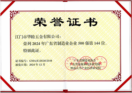華津集團旗下江門市華津金屬制品有限公司和江門市華睦五金有限公司憑借強大的實力和卓越的品質,榮登“2024年廣東省制造業500強企業”榜單。